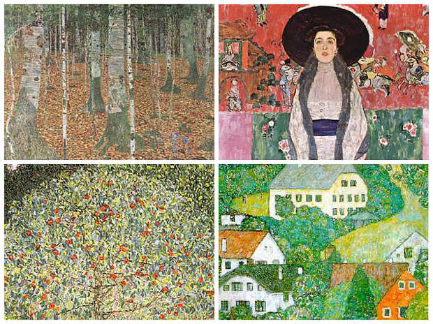Четыре картины, которые были возвращены Марии Альтман вместе с «Портретом Адели Блох-Бауэр». По часовой стрелке: «Березовая роща» (1903), «Портрет Адели Блох-Бауэр-2» (1912), «Дома в Унтерахе близ Аттерзее» (1916), «Яблоня I» (1912)