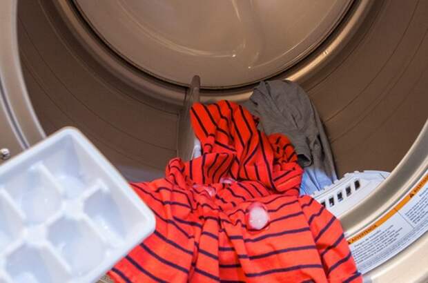Чтобы не возиться лишний раз с утюгом после сушильной машинки, добавьте немного льда. Сложите в сушилку одежду, выставьте программу с максимально теплой температурой и бросьте к вещам два-три замороженных кубика. У вас получится эффект влажной сушки, благодаря чему одежда получится намного ровнее, чем обычно.